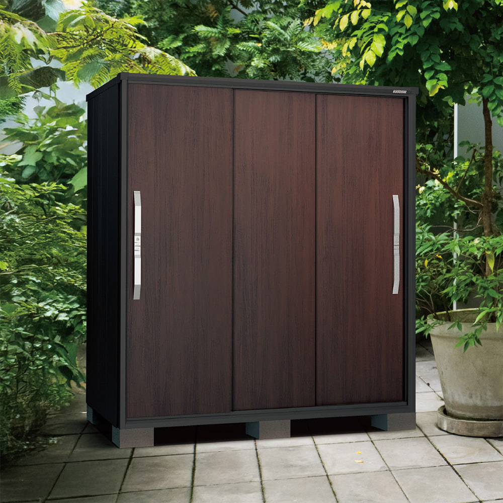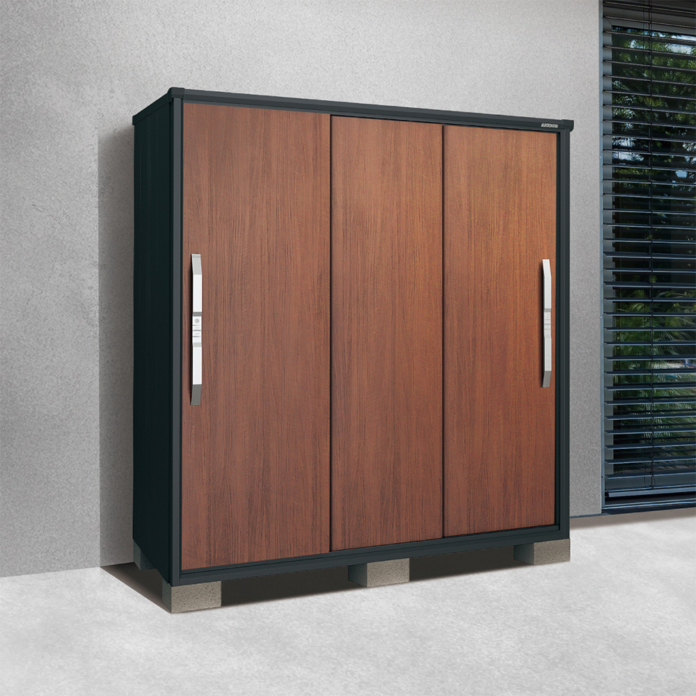 様々な建築物に採用されている高品質なガルバリウム鋼板を使用し高耐久・高防錆性を誇っています。物置の構造として、扉下のレールが無い為、掃除しやすくスムーズな扉の開閉ができます。また、木目調の扉色も人気の一つです。