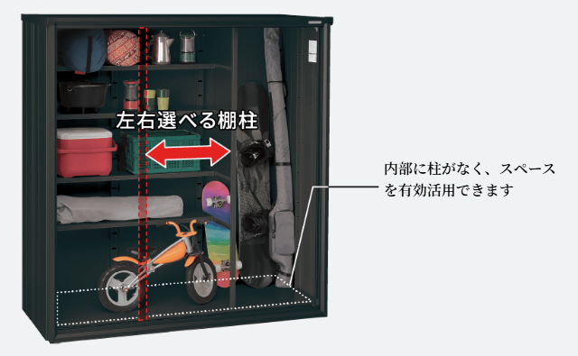 ヨド物置エスモは収納しやすさ抜群の分割棚です。棚板を支える棚柱は左右どちらでも選択OK。 L サイズとS サイズ※、2種類の棚板を使って前後左右自由に組み合わせて配置できるので、さまざまな形状の荷物の収納に対応できます。