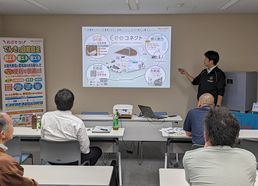 過去6回セミナーを開催し多くの方にご参加いただきました。シャープ専任講師による「でんきの自給自足」に関する講義のあと、リラックスした雰囲気のなか講師の方に様々な質問を投げかけたり、当社展示場の最新設備を熱心にチェックされておられました。