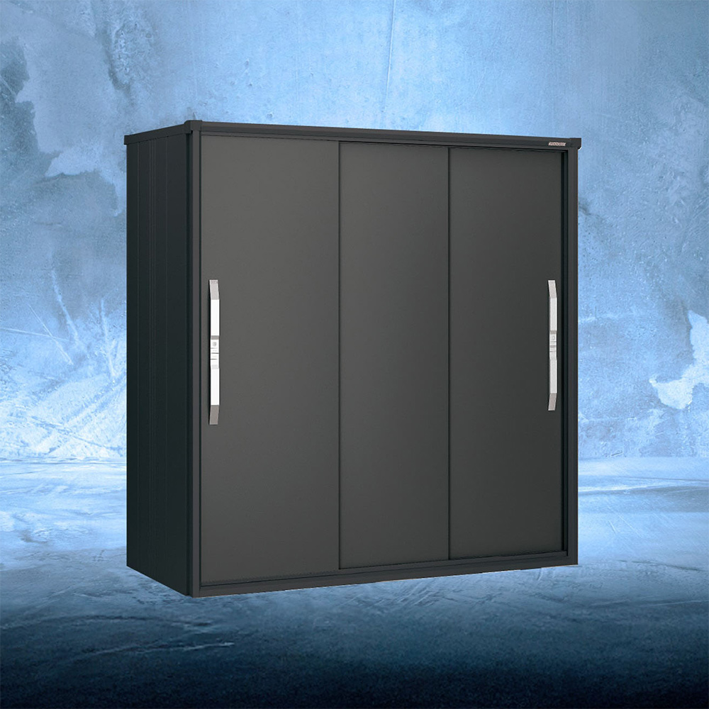 ヨド物置エスモは3枚扉。左右どちらからでも扉が動くから、左右はもちろん中央に入れた荷物も取り出しやすい!出し入れスムーズで便利な物置です。