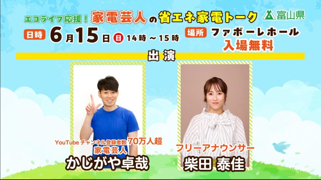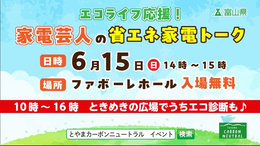 | 開催日時 会場 | 2025年6月15日(日) 【トークショー】 14:00~15:00 @ファボーレホール 【うちエコ診断&アトラクション】 10:00~16:00 @ときめきの広場 会場:フューチャー シティー ファボーレ |