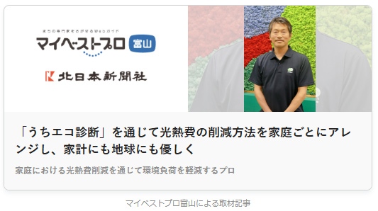 このたび、弊社スタッフの杉本康彦が「家庭における光熱費削減を通じて環境負荷を軽減するプロ」としてマイベストプロ富山に登録されました。